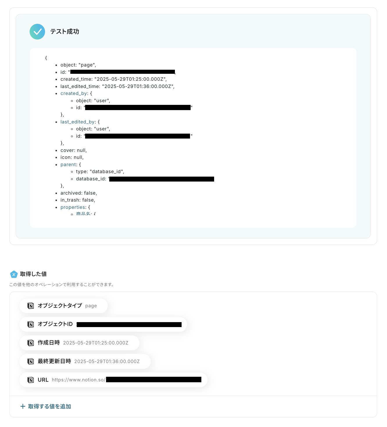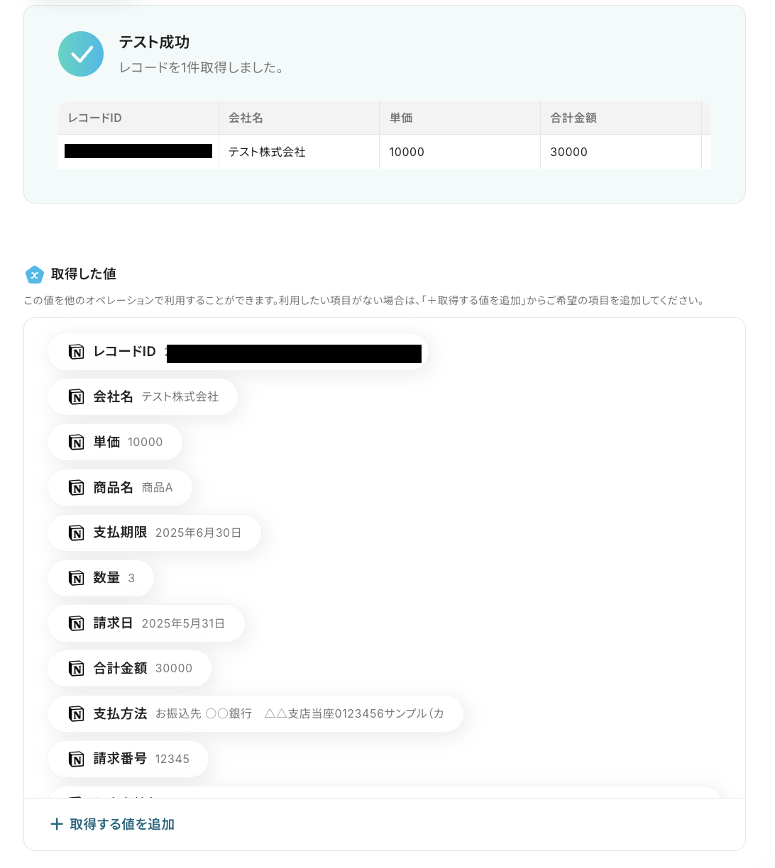 設定後は「テスト」をクリックし、先ほどテスト用に追加したレコードの情報が取得されることを確認しましょう!