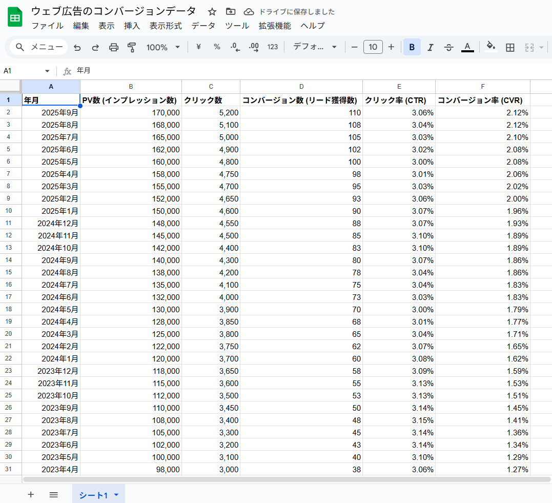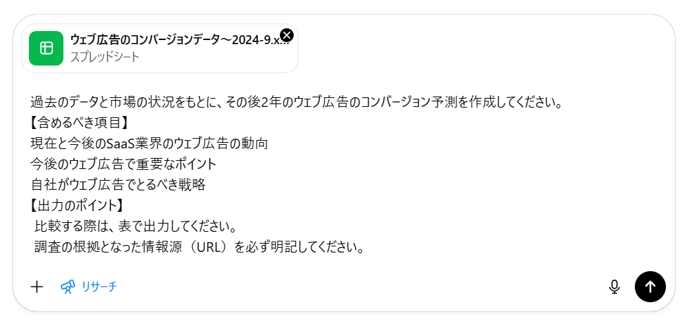 検証するアウトプット:過去のデータと市場の状況をもとに、今後1年のウェブ広告のコンバージョン予測