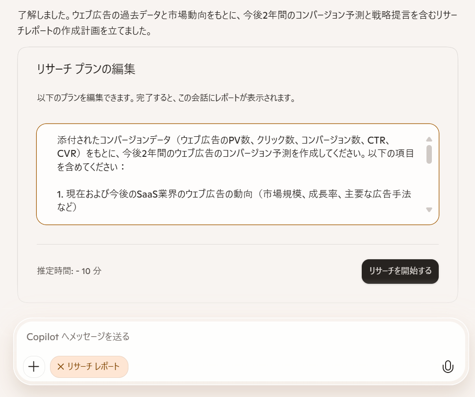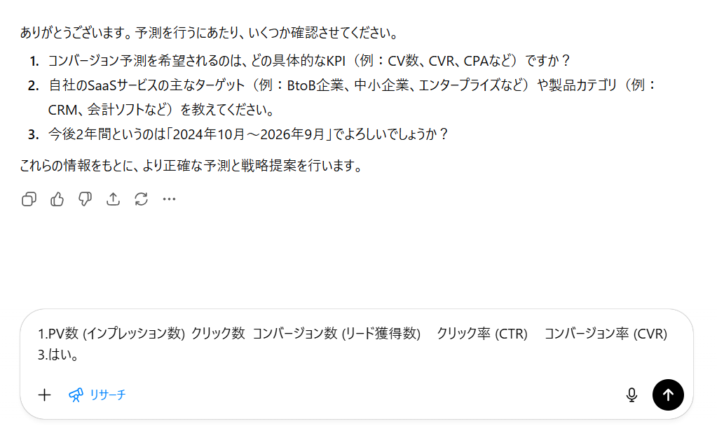 またMicrosoft Copilotは、多くの資料をリサーチすることは得意ですが、その結果を予測値に反映させる精度は高いと言えません。