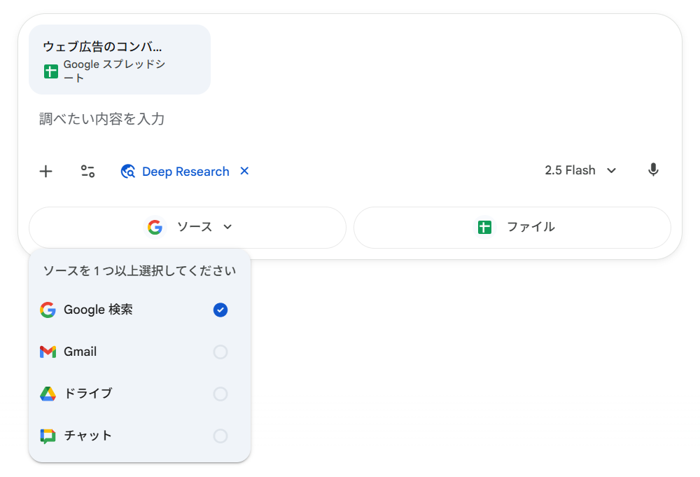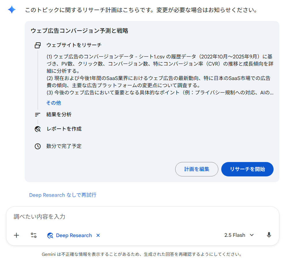 2025年10月時点、無料プランでDeep Researchを利用できるモデルは「2.5 Flash」のみです。