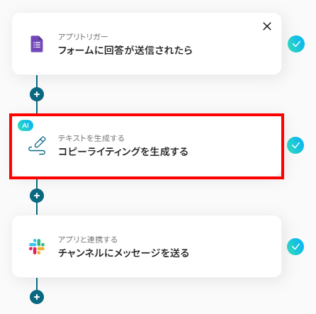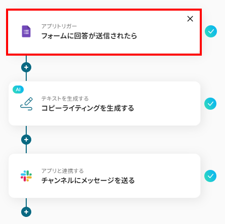 それではここから代表的な例として、Googleフォームに新しい回答が送信された際に、その内容に基づいてAIが自動でコピーライティングを行ない、Slackに自動で通知するフローを解説していきます!