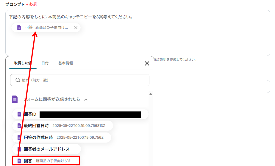 Googleフォームの回答を活用して、AIに対しての指示を入力してください。