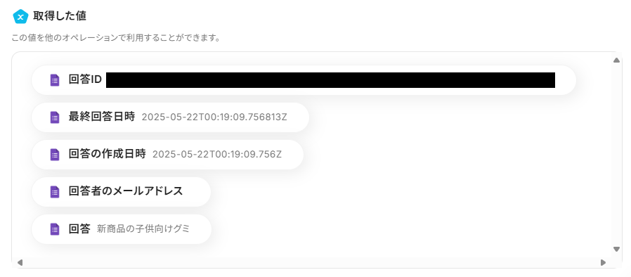※Googleフォームをトリガーに設定した場合の回答データの取得方法については、こちらを参考にしてみてくださいね。
