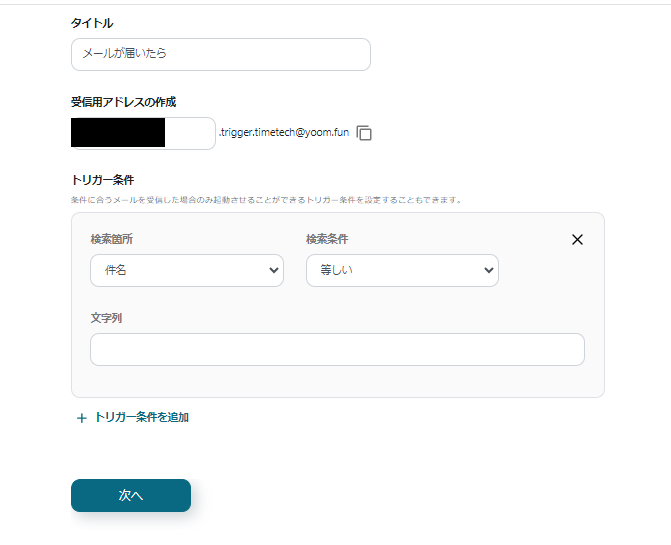 1つ目のステップ、メールトリガーの条件設定を入力します。