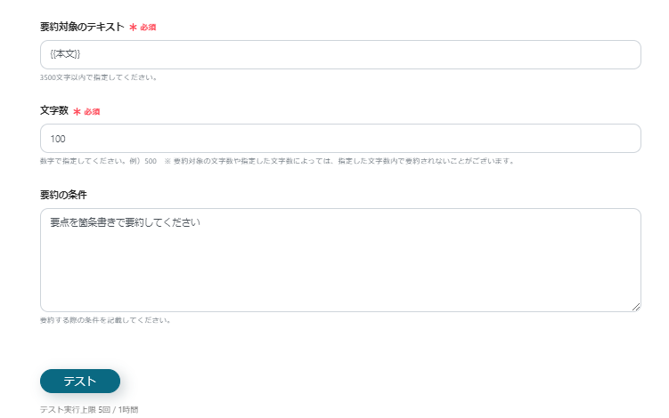 要約の条件:任意で設定してください。(「要点を箇条書きで要約してください」等)