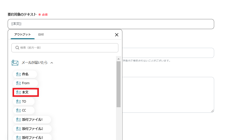 要約対象のテキスト:アウトプットの中の「メールが届いたら」をクリックし、「本文」を選択します。{{本文}}と表示されているのを確認します。