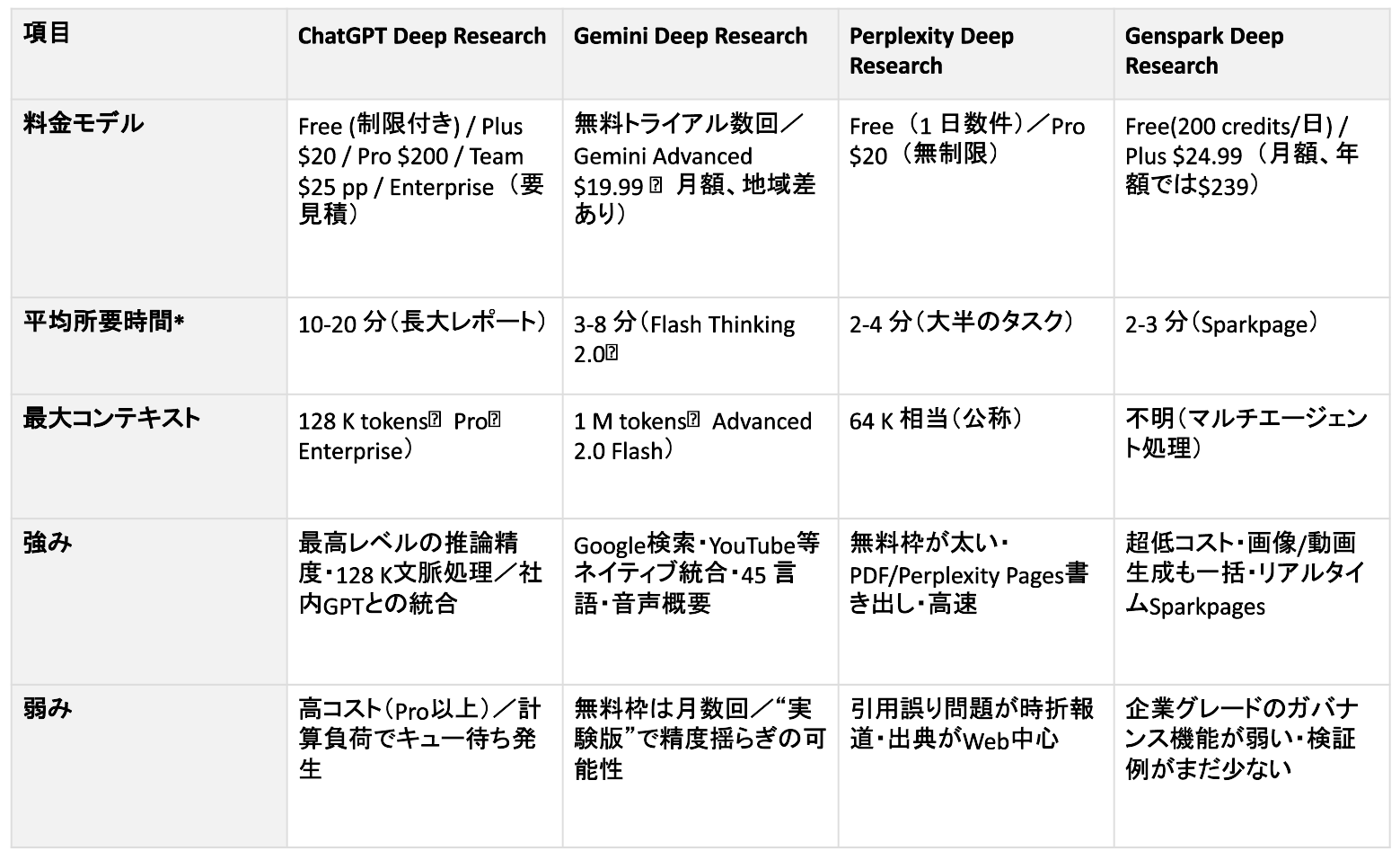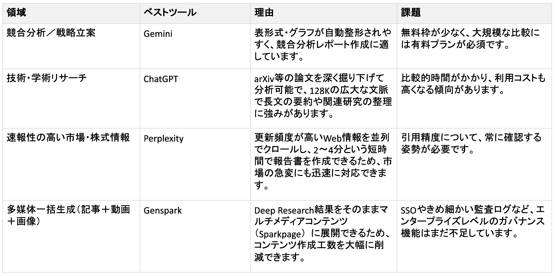 ここでは、代表的なツールにおけるDeep Research機能の特徴、料金、そしてビジネスでの活用ポイントを比較します。まずは、各ツールの主要な比較ポイントを表で確認してみましょう。