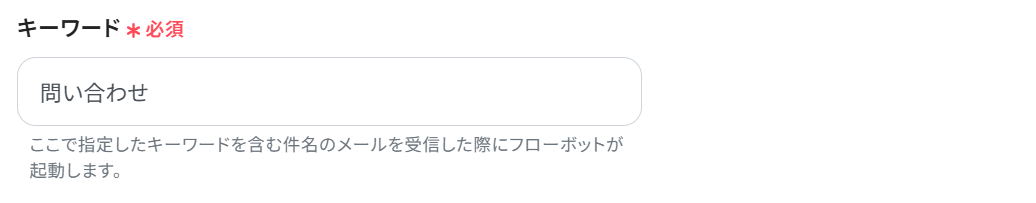 キーワード:ここで設定したワードを含むメールを受信した場合のみ、フローボットが起動します。