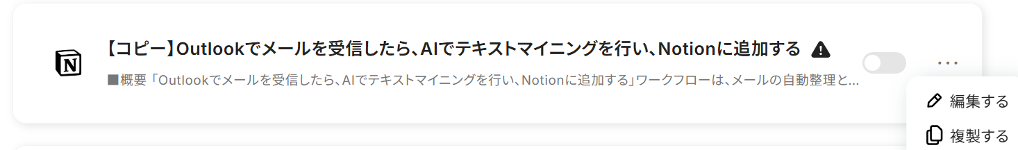 Outlookで受信した情報をAIで抽出し、Notionに追加するフローです。