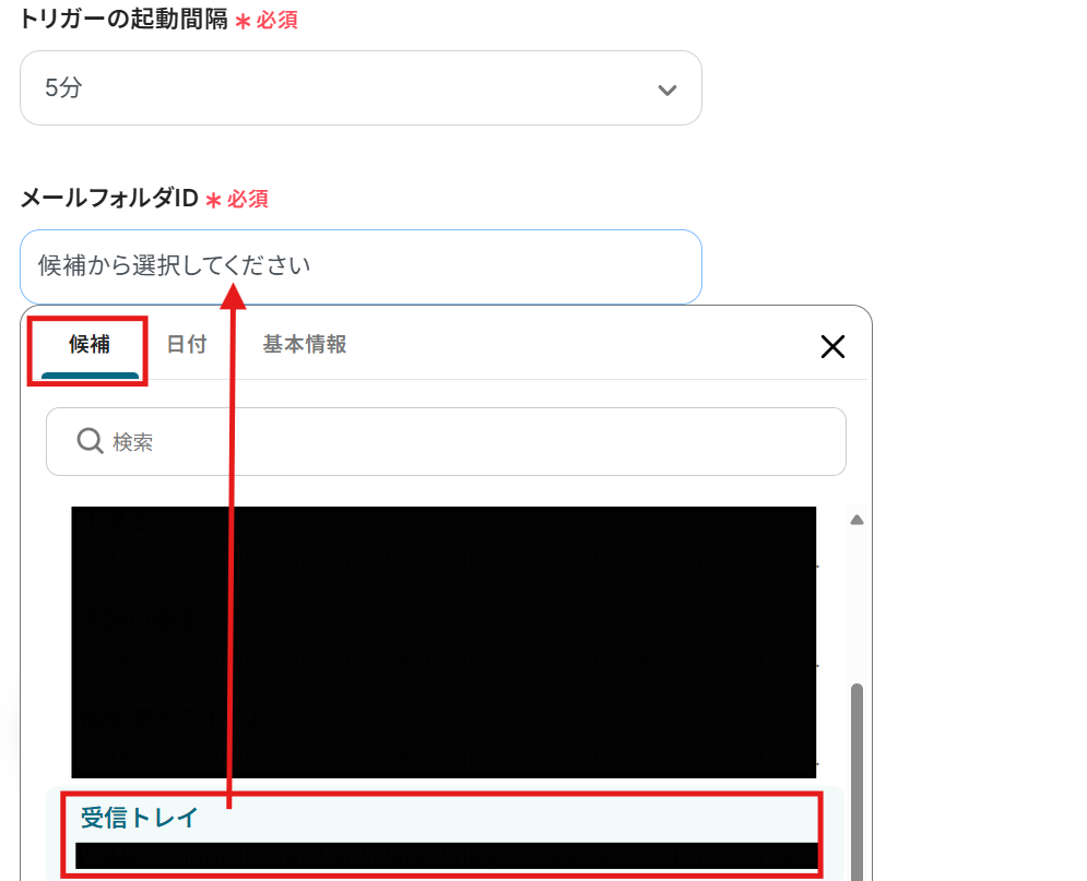 メールフォルダID:該当欄をクリックすると表示される候補から選択してください。