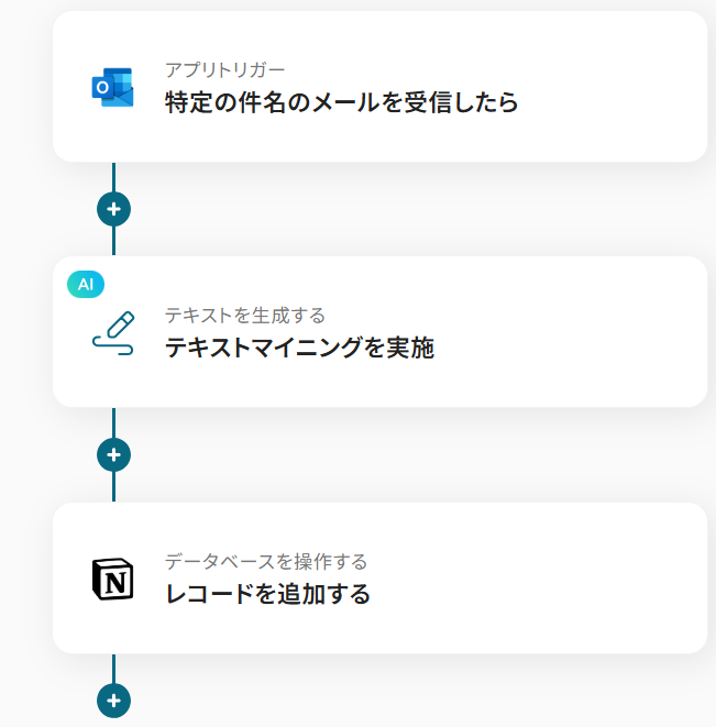 それではここから代表的な例として、Outlookで特定のメールを受信した際に、その内容をAIでテキストマイニングし、分析結果をNotionのデータベースに自動で追加するフローを解説していきます!