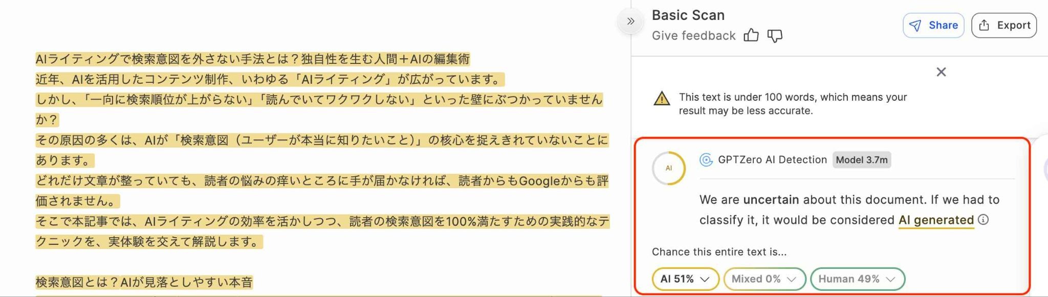 実体験や独自の視点を加えた結果、AI判定は51%まで低下しています。ステータスは「Uncertain(不確実)」となり、ツールが判定を迷うほどに向上しました。