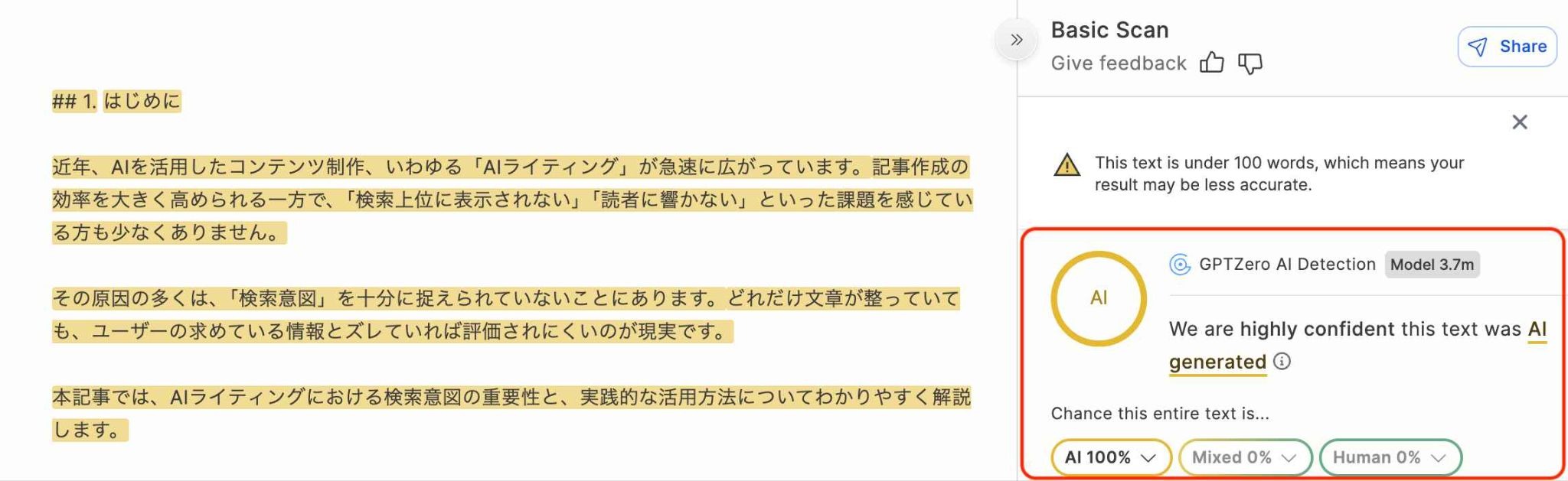 GPTZeroを使って記事をチェックした結果、プロンプト一つで書き出した記事は「AI判定100%」と完全に見破られてしまいました。