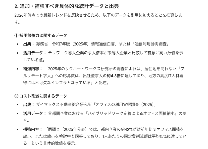 2. 【統計・出典の補強】2024年〜2026年現在の最新状況に基づき、主張を裏付ける具体的な公的機関のデータ、調査報告書、または企業事例を特定してください。