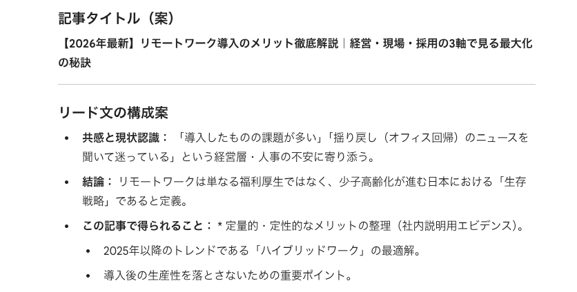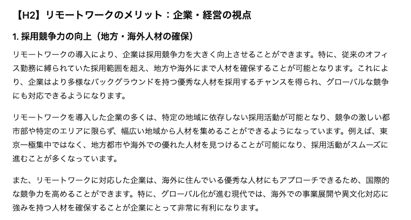 5. 【SEOキーワード】「リモートワーク」「メリット」「生産性」「採用」「コスト」を自然な形で散りばめる。