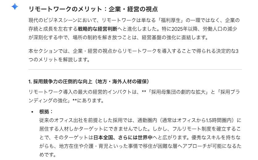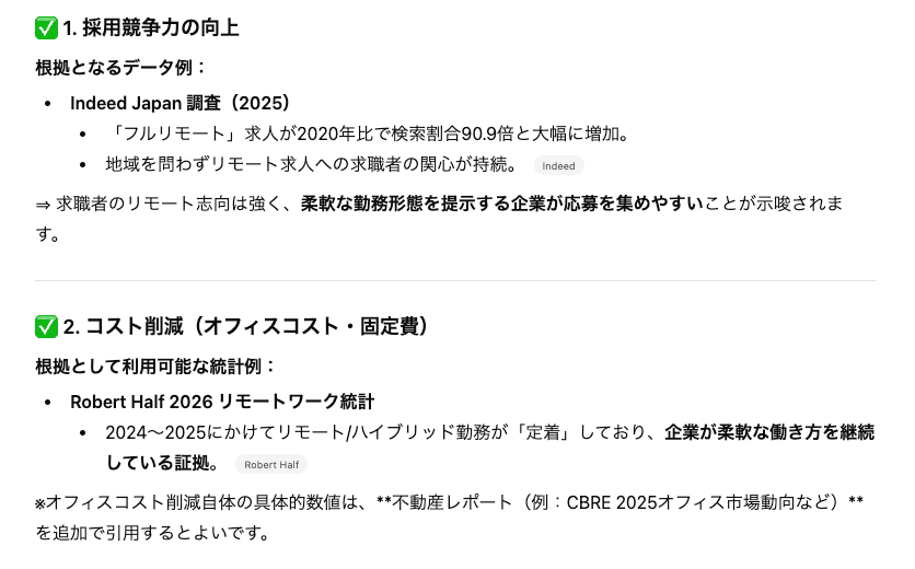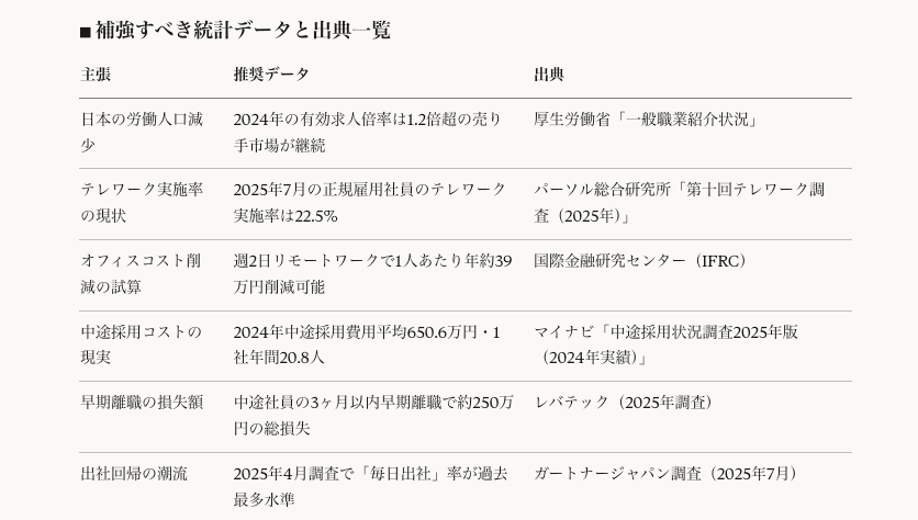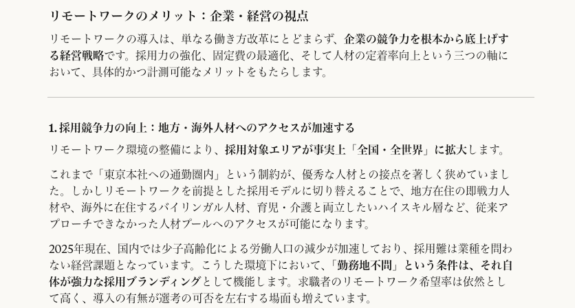 2. 【独自性/E-E-A-T】単なる一般論だけでなく、2025年以降の最新トレンド(ハイブリッドワーク、生産性向上のエビデンス、人材獲得への影響など)を考慮した視点を盛り込んでください。