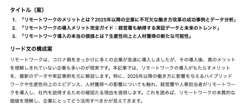 構成案ができたら、一度に全文を書かせるのではなく、「導入文」「各H2見出し」「まとめ」など、パートごとに分けて執筆させることで、長文でも論理破綻を防げます。