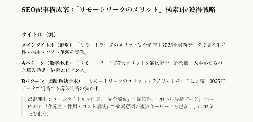 論理的深度とSEO戦略が特徴。データ出典の明示や文字数設計、E-E-A-T(専門性・信頼性)への配慮が緻密です。