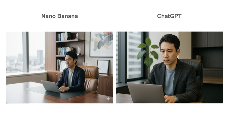 人物の一貫性と画像合成のリアリティの面で、Nano Bananaのほうがクオリティは高いといえます。