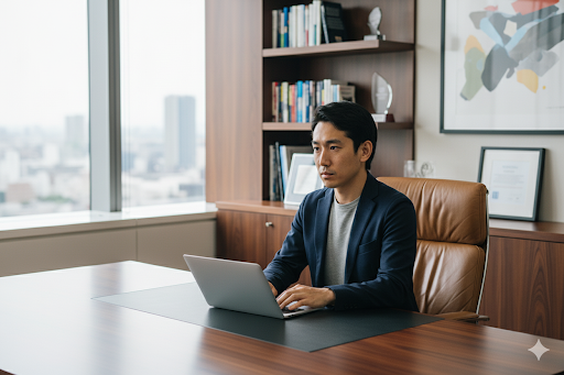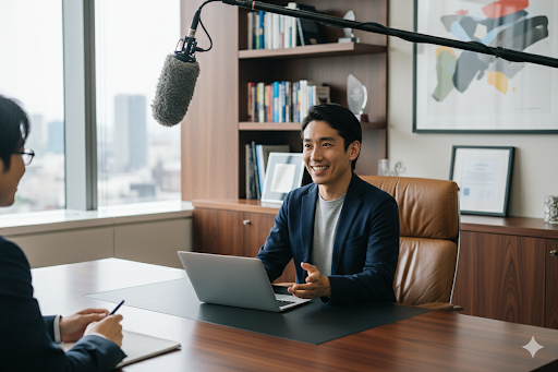 【プロンプト③:「ロゴやタイトルはなくして、この男性が社長室でインタビューを受けている風の横長の写真を作って」】
