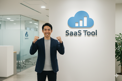 【プロンプト⑤:「この男性が、会社の入り口にある企業ロゴの前で、笑顔でガッツポーズをしている画像を作って。企業ロゴは添付の画像」】
