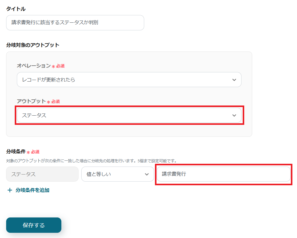 ※下記の設定は、Airtableのデータベースに「ステータス」という項目を作成しており、その内容が「請求書発行」になったときに分岐する条件です。他の項目と値が請求書の発行条件になるときは、アウトプットと分岐条件の右枠を変更してください。