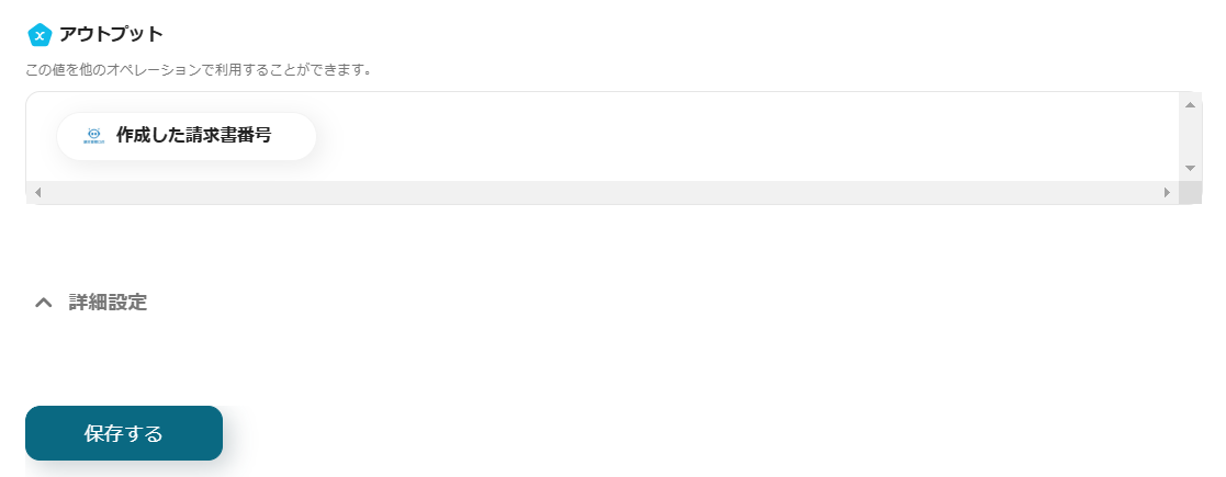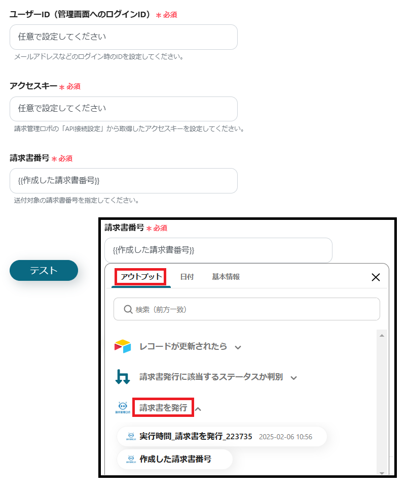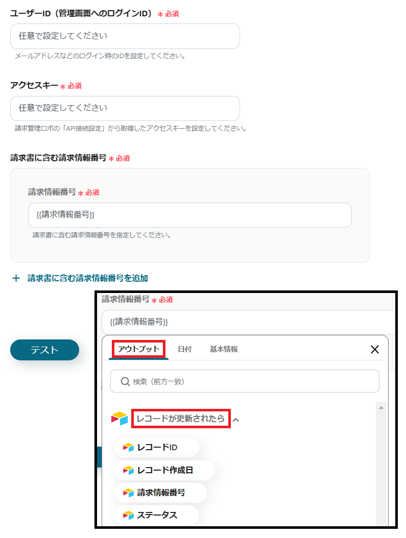 ※請求書に含む請求情報番号は、枠をクリックして表示されるアウトプットの「レコードが更新されたら」から設定します。(値は二重括弧で表示されます)そのため、Airtableに、請求書に含む請求情報番号があらかじめ登録されていることが前提になります。