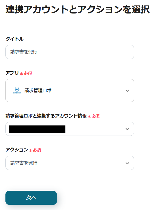 2.請求管理ロボと連携するアカウントを確認し、「次へ」をクリックします。