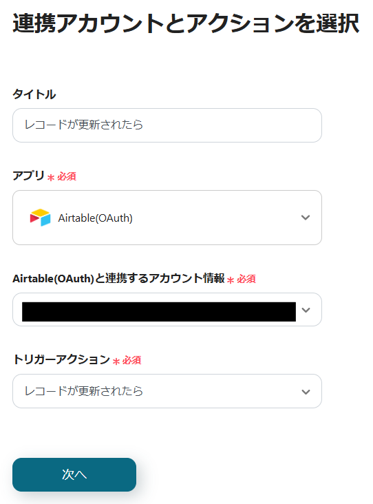 3.Airtableと連携するアカウントを確認し、「次へ」をクリックします。
