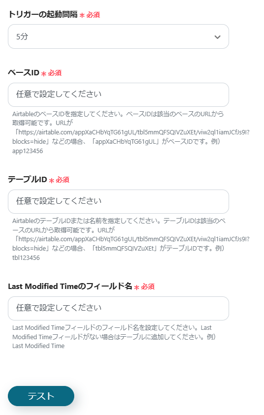 4.トリガーの起動間隔、ベースID、テーブルID、Last Modified Timeのフィールド名を設定してテストを行います。