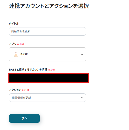 連携アカウントとアクションを選択する画面が表示されるので、今回連携するBASEのアカウントを確認し「次へ」をクリックします。