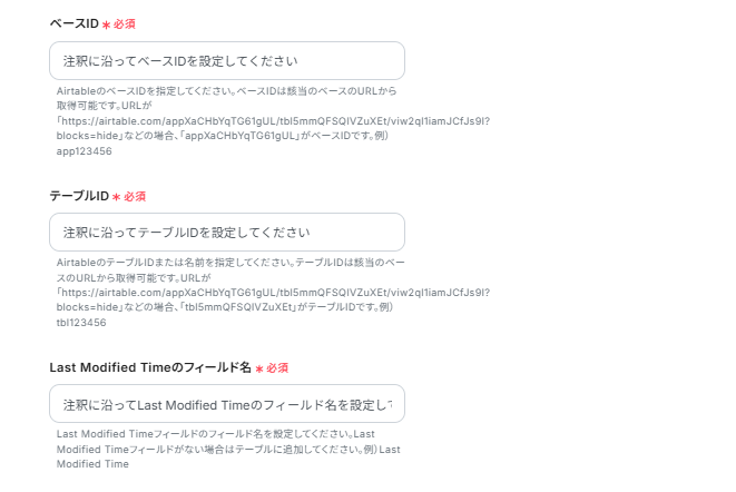 以下の画面が表示されるので、注釈に従ってベースID、テーブルID、Last Modified Timeのフィールド名を入力しましょう。