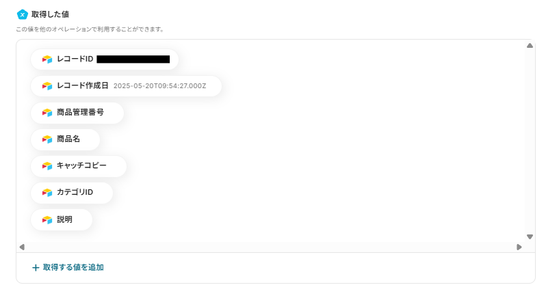 以下のように取得した値の箇所にAirtableから取得した情報が表示されていればテスト成功です。