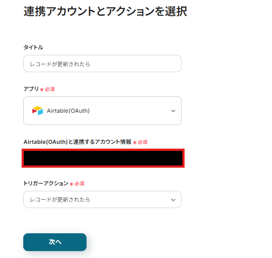 連携アカウントとアクションを選択する画面が表示されるので、今回連携するAirtableのアカウントを確認し「次へ」をクリックします。