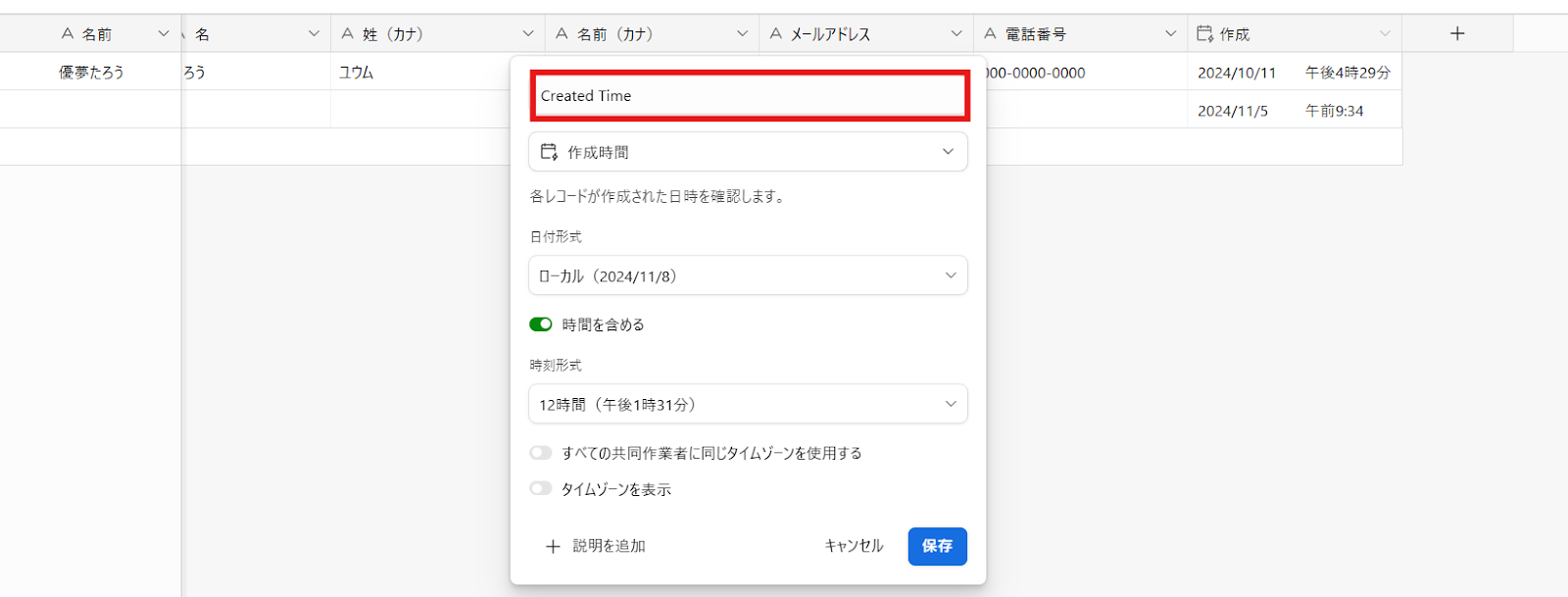 Created Timeは、「作成時間」でフィールドを作成しましょう。
