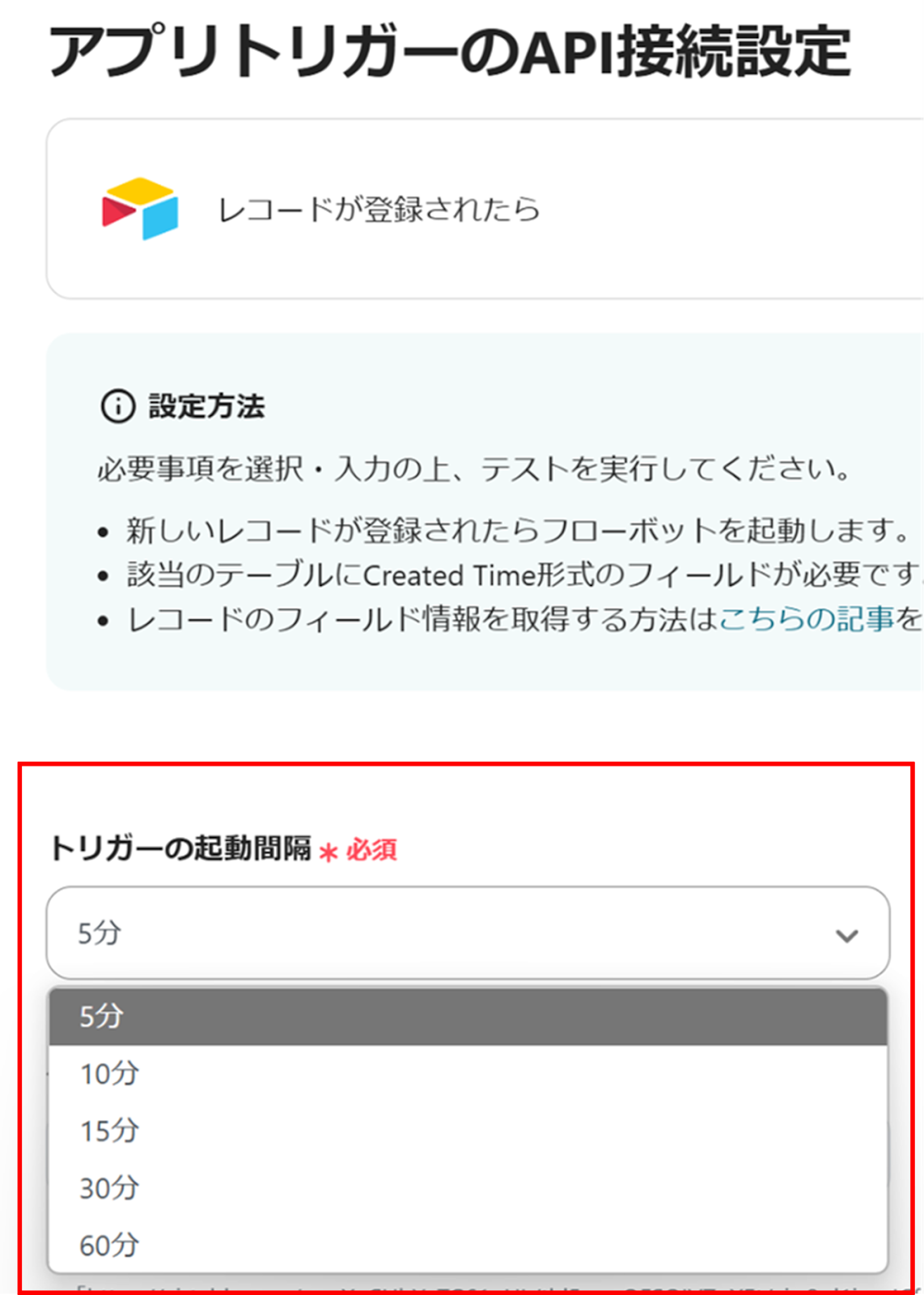 (3)「API接続設定」画面から、トリガーの起動間隔を選択します。