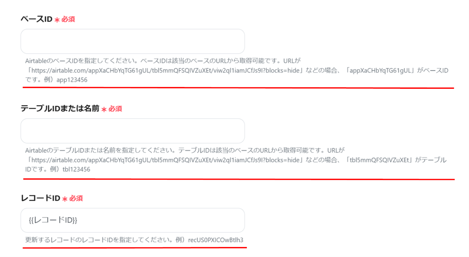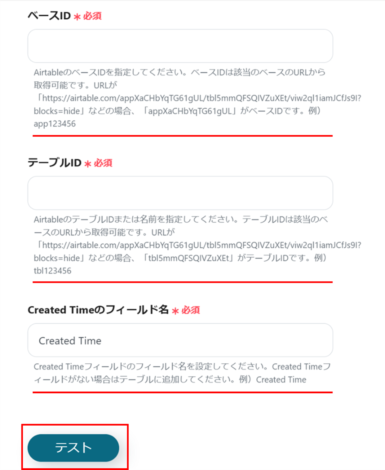 下へ進み、ベースID、テーブルID、Created Timeのフィールド名を赤線を確認の上、入力を行ってください。