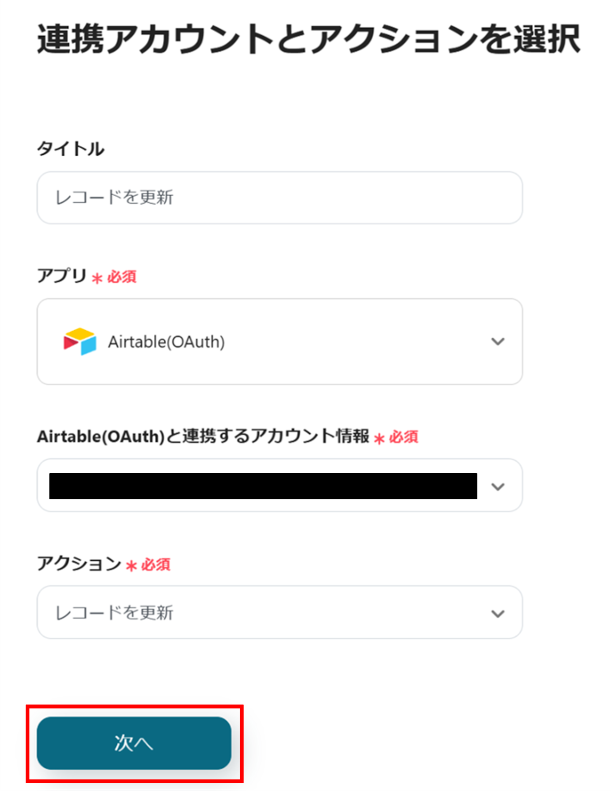(2)Airtableの「連携アカウントとアクションを選択」画面から、Airtable(OAuth)と連携するアカウント情報に誤りがないかを確認し、アクションは「レコードを更新」のままで「次へ」をクリックします。
