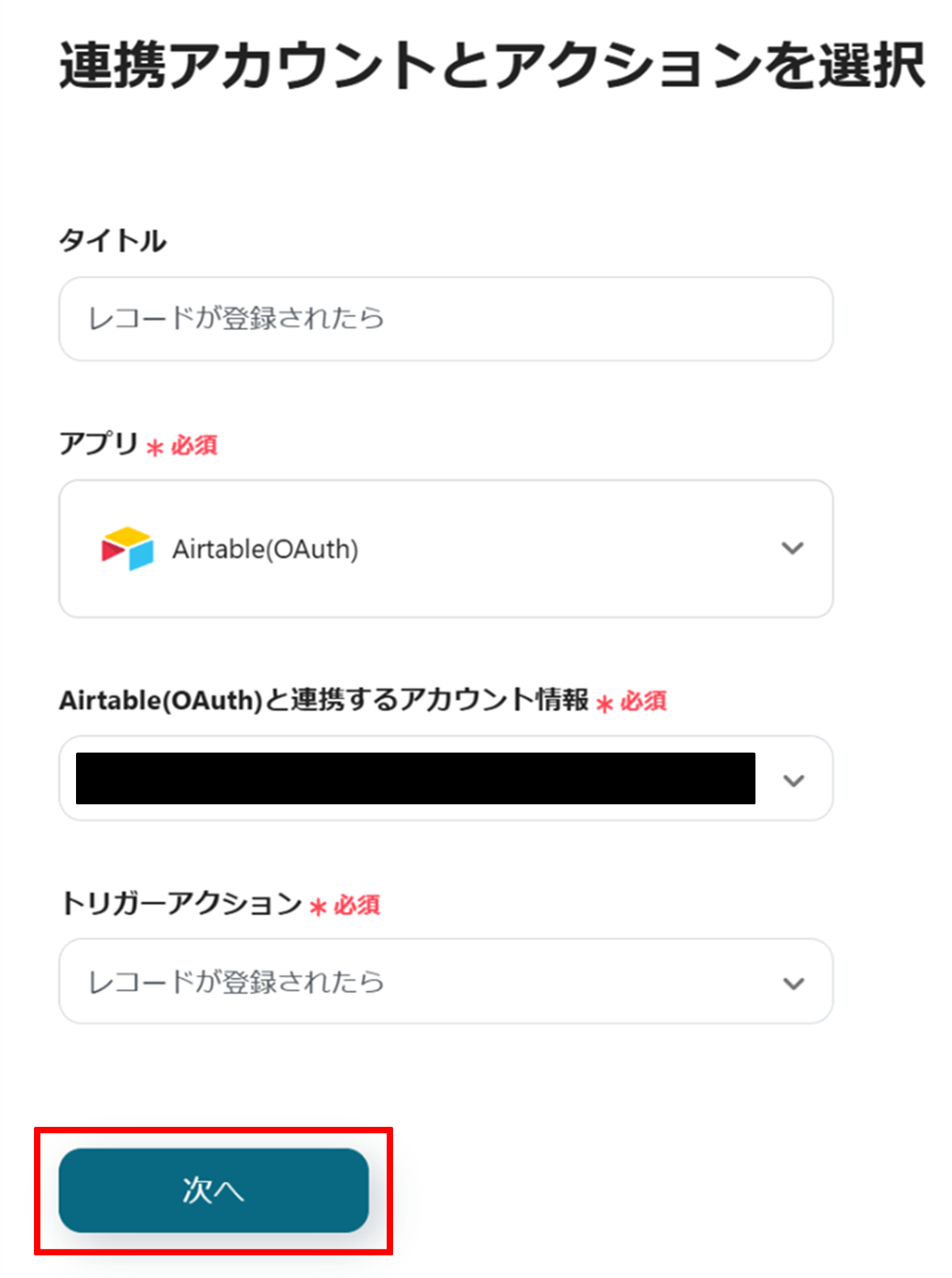 (2)Airtableの「連携アカウントとアクションを選択」画面から、Airtable(OAuth)と連携するアカウント情報に誤りがないかを確認し、トリガーアクションは「レコードが登録されたら」のままで「次へ」をクリックします。