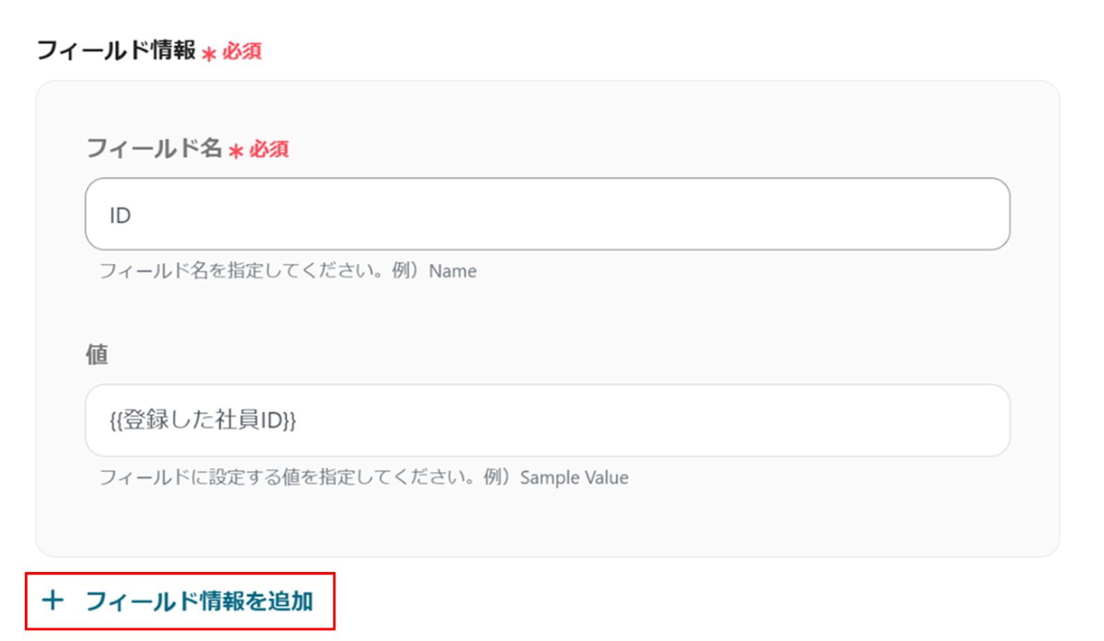 フィールド情報を追加したい場合は「+フィールド情報を追加」をクリックすることで追加ができます。