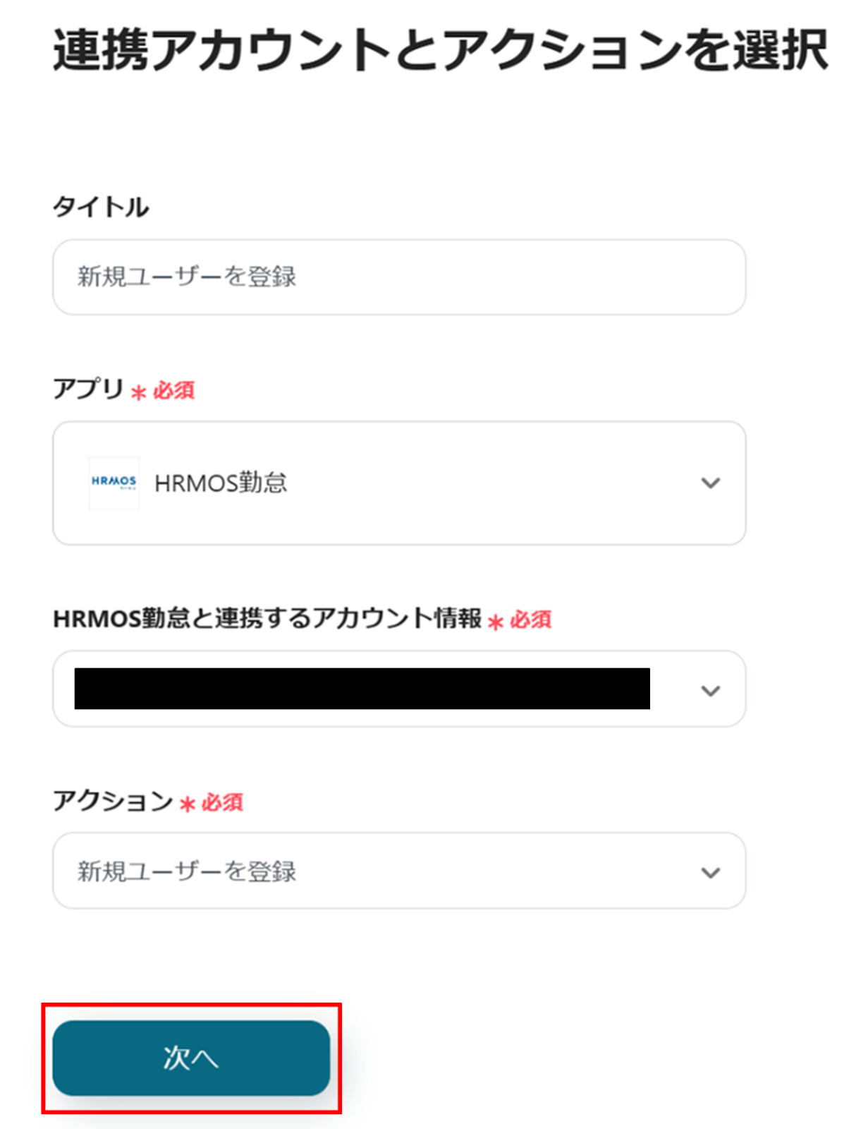 (2)HRMOS勤怠の「連携アカウントとアクションを選択」画面から、HRMOS勤怠と連携するアカウント情報に誤りがないかを確認し、アクションは「新規ユーザーを登録」のままで「次へ」をクリックします。