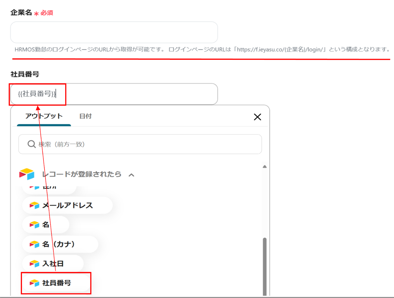 レコードIDはアウトプットから選択します。