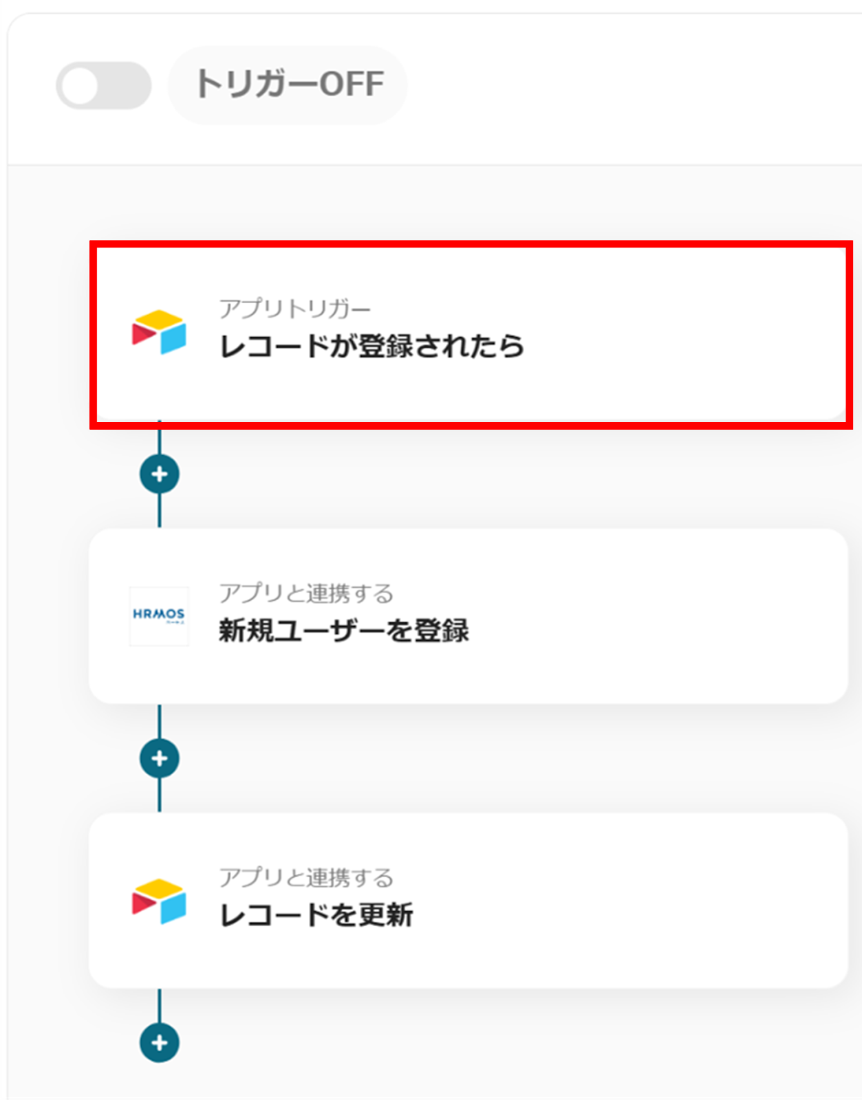アプリトリガーの「レコードが登録されたら」をクリックします。