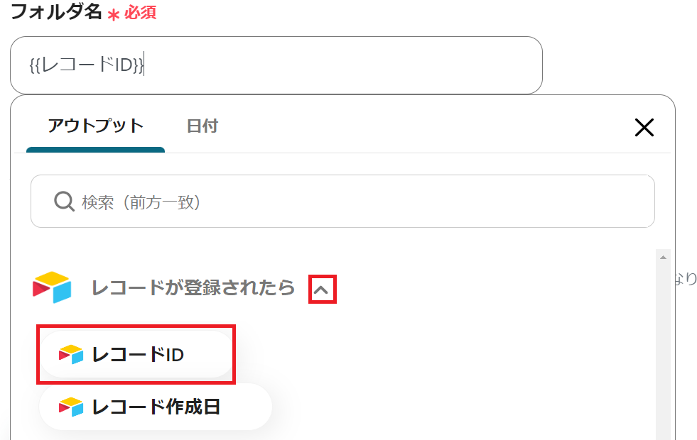 以下の画面が表示されたら、Airtableのアウトプットを利用して「フォルダ名」を入力しましょう。