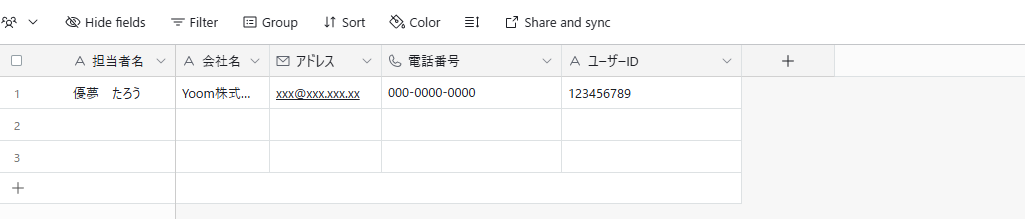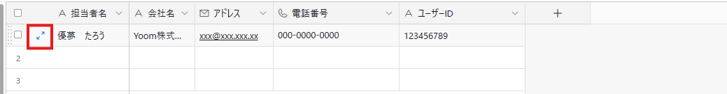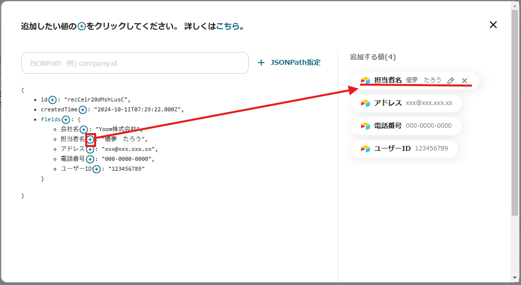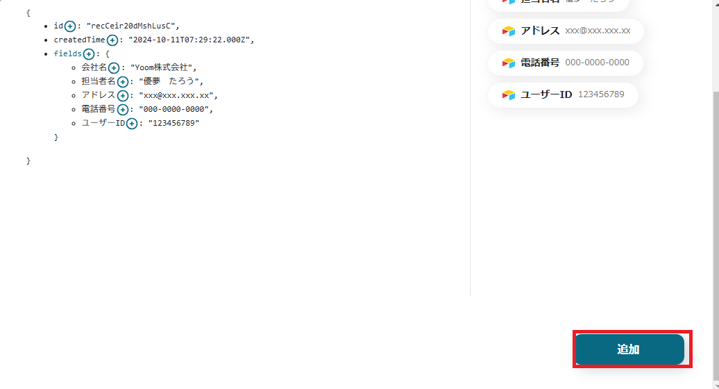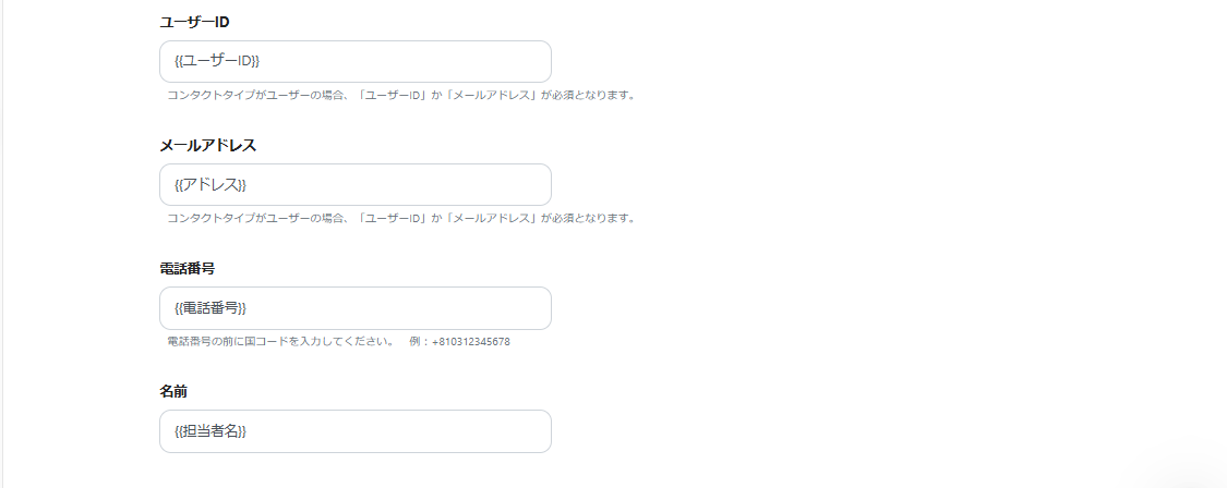 今回は、担当者名、アドレス、電話番号、ユーザーIDの「+」マークをクリックし追加していきます。