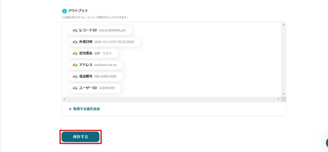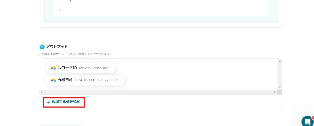 アウトプットにある「+取得する値を追加」をクリックしてください。