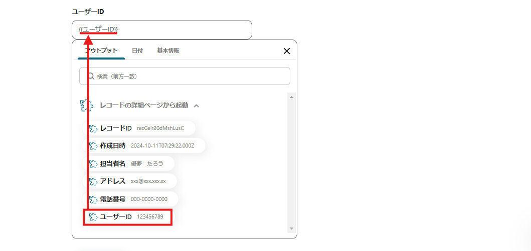 解説)このように設定することで、Airtableに登録した「ユーザーID」を取得し、Intercomにも自動でユーザーIDを登録することができます。