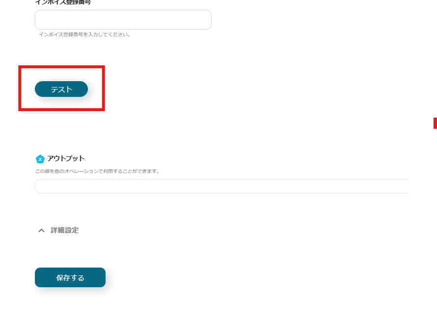 入力が完了したら、以下画像の赤枠内の「テスト」をクリックします。