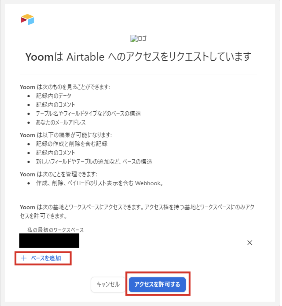 Airtableのアプリアイコンが出てきますので、そちらをクリック後、「+ペースを追加」から該当するワークスペースを選択して、「アクセスを許可する」をクリックします。