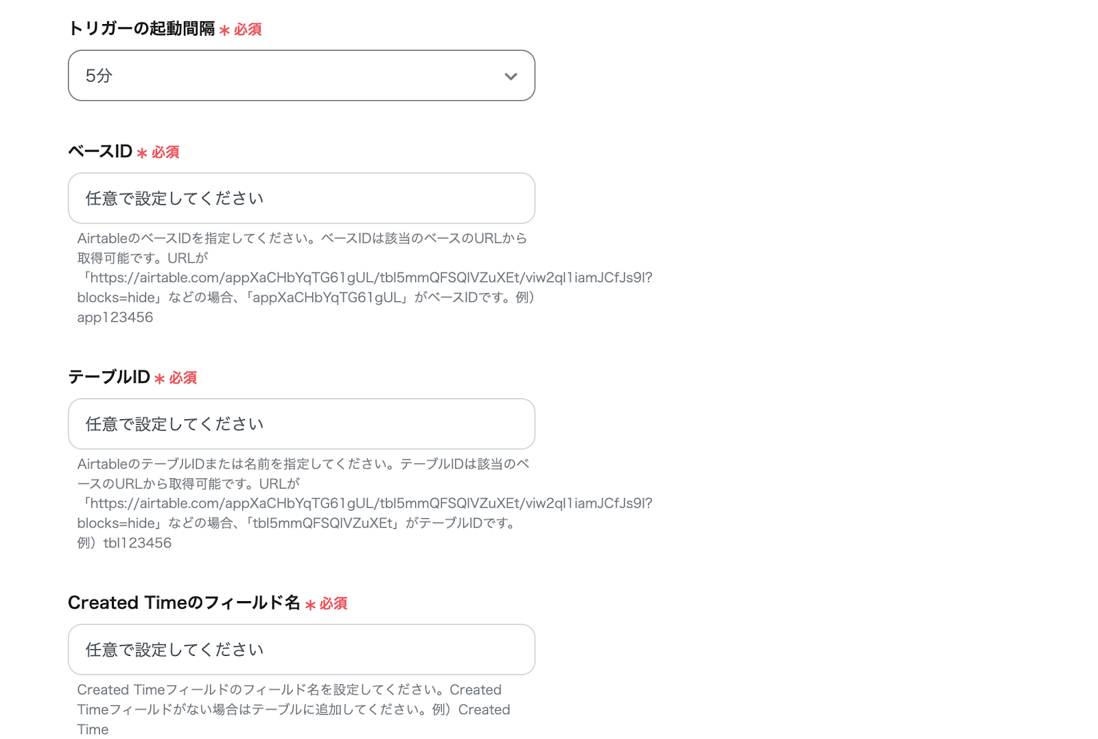 「ベースID」、「テーブルID」、「Created Timeのフィールド名」は注釈部分を確認して設定を行いましょう。